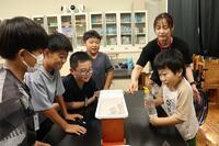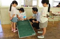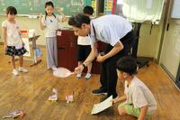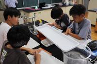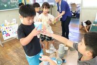 理科の授業で「流れる水のはたらき」と題し、水の特性について、川の流れなどを想像しながら実験をしました。最初に「水のはたらき」について陣先生から聞かれると、「高いところから低いところに流れる」とを発表することができました。「では、近くの川は?」と聞かれると、首をかしげ、考え込む児童が多かったです。「学校の住所は?」とヒントを出されると、みんな「細見」と答え、「では川の名前は?」にみんなで「細見川~!」と答えがでました。