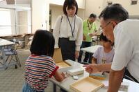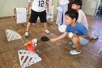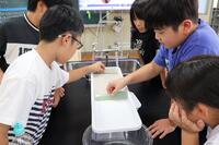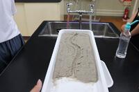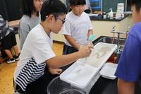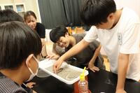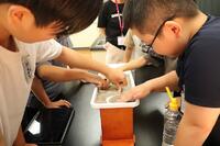 傾斜のついた容器に砂を入れ、水を流したときにどのような流れになるのかの実験がスタートしました!みんな砂を湿らせ、指で道(道路を想定)を作り、水を流し込む実験を行いました。結果はお子さんに聞いてみてくださいね。