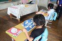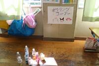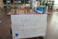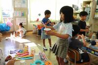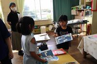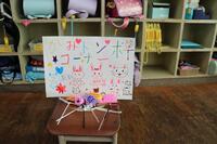 今日は、待ちに待った「おもちゃランドの日」。この日のために2年生10名は、コツコツとおもちゃ作りに励み、どう遊んでもらうかを考えてきました。まずはそれぞれのお店の準備の様子からです。「1年生が主役で、上手に遊び方の説明をしようね」と西山先生のお話がありました。