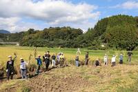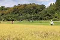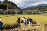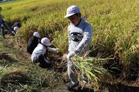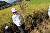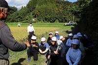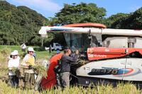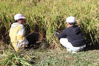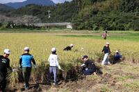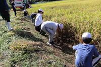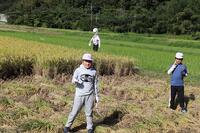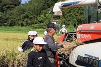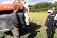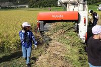 最後は、脱穀です!1人1人が刈った稲の束を小谷さんに渡し、コンバインに入れていきます。