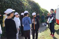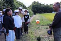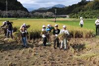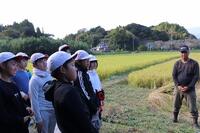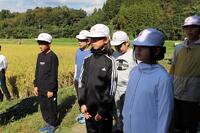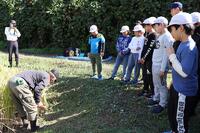 今日は、とても暑かったですね。5年生は、大晴天のなか、稲刈り体験をしました。小谷さんの田んぼを借りて、田植えから稲刈りまでを体験させていただきました。最初にカマの使い方を小谷さんに教えてもらい、次に刈り方を見せていただきました。みんなも軍手をつけて、準備は万端!さあ、一生懸命に手刈りにチャレンジしましょう!