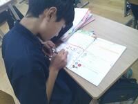 中学1年生の英語では、これまでに学んだ基本の単語や文法、表現を振り返る復習の時間を行いました。生徒たちはワークブックを使いながら、単語や文法の確認に取り組みました。穴埋め問題や会話練習を通して、正しい文の作り方を確認し、間違えた部分は再度確認することで理解を深めています。友だちと声に出してやり取りをすることで、学んだ表現を実際に使う力も少しずつ身についていきます