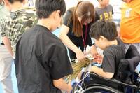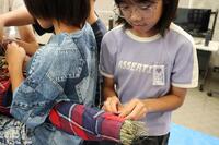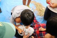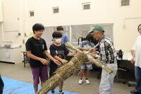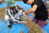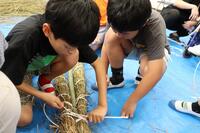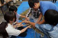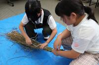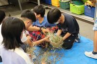 小学5年生は、総合的な学習の時間を活用して、1学期からお米を育てています。夏を経て、とてもよく実っている状況です。その田んぼに配置するオリジナルのかかし作りをしました。教えてくださる地域の方2名をお招きし、保護者にも見守っていただき、2体を製作しました。まず、かかしの体作りです。わらを多めに取り、束にしています。