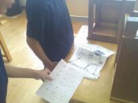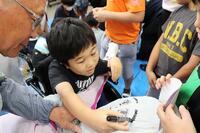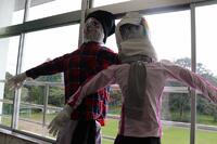 最後はみんなでかかしに衣装を着せて、さらに顔にマジックで表情を描いていきました。みんな真剣、、、。