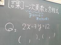 中学2年数学の授業では一次関数と方程式について学びました。(一次関数と一次方程式の関係も学びました。)一次関数のグラフから特定のyの値に対応するxの値を求めることは、方程式を解くことと同じ考え方だということに気づき、問題解決力を深めています