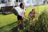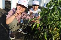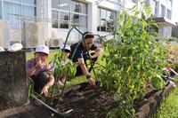 お次は小学2年生。こちらも担任の先生と夏野菜の収穫(まだピーマンとナスが小ぶりですがたくさん実っています)