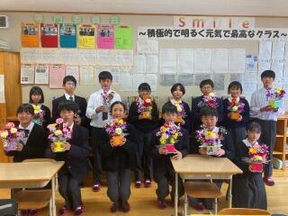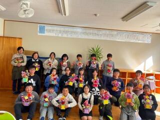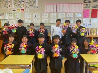 最後にできあがった作品とともに記念写真。大事そうに抱えて帰る子がいたり、落ちないように自転車に乗せて帰る子がいたり普段とは違った一面を見ることができ、ほっこりしました。元々ピュアな南方中学校の子どもたちですが、花々に癒やされて、ますます天使のように見えました。