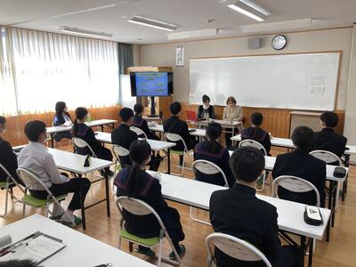延岡市企画部男女共同参画推進室が企画する性教育講話が行われました。講師に「ハートスペースM」より2名の方々に来ていただき生徒に話をしていただきました。今回の講話には中学部2年14名が参加しました。デートDVとは何か、お互いの人権を大切にする付き合い方など生徒が今や未来を生きていくうえで必要な知識や対処法を学ぶことができました。50分の講話でしたが、終了後に生徒の話を聞く態度が素晴らしいと講師の先生からお褒めの言葉をいただき大変嬉しく誇らしい気持ちになりました。