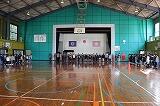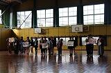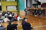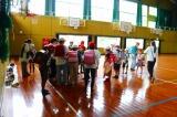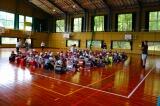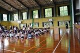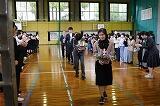 最初に第1体育館でお別れ集会を行いました。5年生の司会進行のもと、1年生から順番に、歌や言葉のプレゼントを6年生へ届けました。