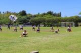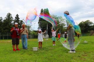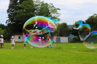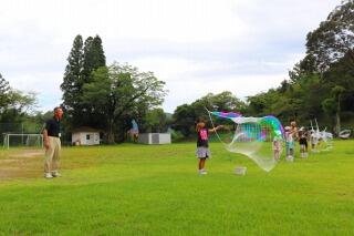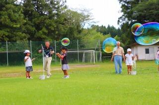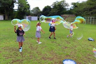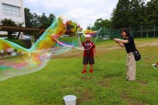 社会教育課の先生の素晴らしいノウハウで、大きな大きなシャボン玉が運動場いっぱいに浮かびました。