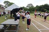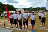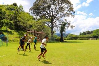 竹馬で50mを10秒で走り抜けるというチャレンジ。夏休みを前に熱く盛り上がった上南方小中学校です。