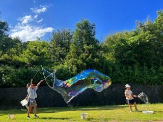 道具も全て手作りで、計算し尽くされており、次から次に生まれ出るシャボン玉に歓声の嵐