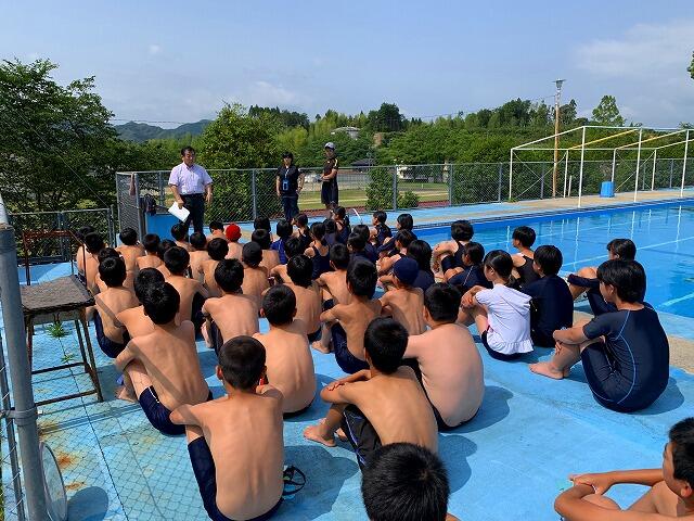 本日の2時間目に、5,6年生がプール開きを行いました。始めに教頭先生から、「安心しない」「あわてない」「あなどらない」の3つの「あ」を合言葉に、今年も安全に楽しく水泳の学習をしていくための話がありました。子どもたちは真剣な様子で話を聞いていました。その後、準備運動などを済ませて、早速プールに入って学習をしました。水は少し冷たかったようですが、元気いっぱい水の中で動き、とても楽しかったようです。1~4年生も今週から水泳の学習に入る予定です。