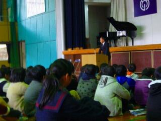 後半は、小学部のみ参加の講話がありました。合言葉「いかのおすし」の確認や、実際にあった事例を基にした、「声をかけられたときの逃げ方」を教えていただきました。