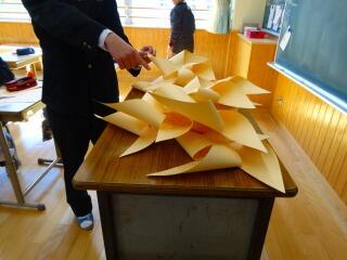 2月15日(水)の学年末テスト終了後、学年ごとに色分けされた画用紙を使って、「風車(かざぐるま)」を作りました。これは延岡市の『延岡花物語事業』の一環で、五ヶ瀬川の堤防に130mの“風車(かざぐるま)アート”をつくろうというものです。市内の各学校に声がかかり、我が上南方中学校:中学部は、生徒会長の「やります!」という積極的な一声で参加が決定。生徒会より作り方の手順が説明された後、「風車(かざぐるま)」の羽の部分に自分の名前と願い事を書き込み、一人4つのノルマを果たすべく、生徒全員頑張りました。以下は、製作の途中段階と完成品です。(注:本校で作られた「風車(かざぐるま)」は、ニニギノミコトの部分に使われるとのことです。期間中、近くを通る時には是非確認してみてください。)