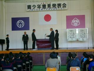 小学部4年生~中学部3年生が参加し、「各学年の代表者による意見発表」、「中学部2年生の立志式」、「いじめ防止の標語の表彰」、「日頃、学校や地域がお世話になっている方の特別表彰」が行われました。早朝より、青少年育成センターの『小村周司所長』にご参加いただき、多くの保護者・地域の皆様の前で、代表の児童・生徒はしっかりと自分の意見を発表することができました。今回の特別表彰では、「(毎年8月に行っている)クリーン作戦」や「PTA奉仕活動」のサポートをしていただいている西部処分場の『甲斐重孝社長』に感謝状を受け取っていただきました。