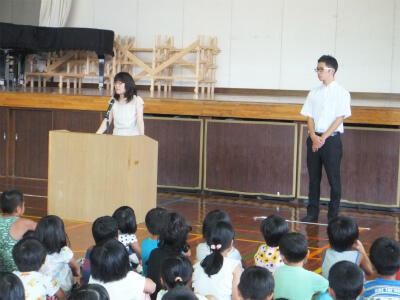 田中 佑樹先生の紹介や、上南方駐在所の新原所長のお話に、子どもたちは真剣に耳を傾けていました。不審な車や、危険な場面を目撃した時には「ナンバーを覚える」とのことです。新原所長にはこの後、職員向けに、不審者対策の研修も行っていただきました。いつも地域の安全を守って下さりありがとうございます(^^)
