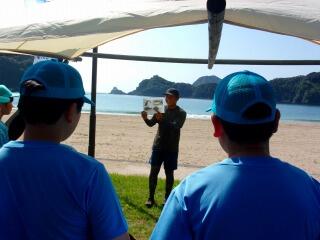 ビーチクリーンの後は浜で遊ぶ予定でしたが・・・。頑張りすぎて、木陰でお昼ご飯を待ちました。