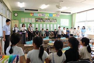 スタッフの皆さんお一人おひとりに、上南方小学校のいちいがしの実と学習で拾って集めてきた貝殻で作成したキーホルダーもプレゼントしました。