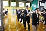 最初に第1体育館でお別れ集会を行いました。5年生の司会進行のもと、1年生から順番に、歌や言葉のプレゼントを6年生へ届けました。