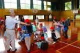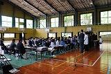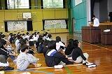 体育館で学年ごとに集会時の整列をしたら、先生の話をしっかり聞きます。
