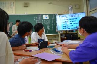 しかし、ICTばかりではなく、ノートにしっかり学習したことをまとめる場面もありました。デジタルとアナログを上手に組み合わせていくことも、とても大切であると感じた授業でした。新文型の説明を聞き、使い方及び意味を知ることもできました。