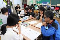中学3年生の英語の授業では、「海のゴミ問題」をテーマにしたリーディングに取り組みました生徒たちは先生の発音に合わせて英文を丁寧に音読し、文の意味を確認しながら学習を進めました。海の環境を守るために自分たちにできることを考えるきっかけにもなりました