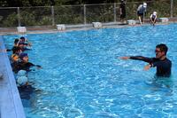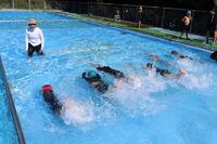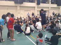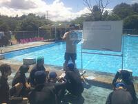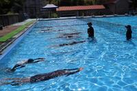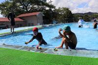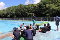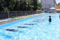 平岡先生も次々に泳ぎきっていく児童にさらに熱のこもったご指導をしてくださいました。「頭を入れるとそれだけで早く泳ぐことができるよ」「平泳ぎでは足を伸ばしたときが一番進むんだよ」と的確なアドバイスがありました。