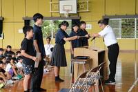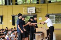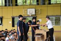 次に表彰式がありました。表彰(小4・中1・中3)の4名の皆さんです。本校の誇りです!そして、山本延久教頭先生からサマーキャンプのカレーコンテストの1位から3位までが発表されました!ドキドキ!の瞬間でしたね。