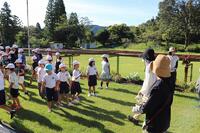 さあ、ラストに登場は「みやざき犬のひぃちゃん」です!突然のサプライズに子どもたちはビックリしていましたが、近くに行ってごあいさつやふれあいができましたね。最後はアーチを作って、「ひぃちゃん」のお見送りと、ダンスを教えてくださった先生方に感想とお礼のあいさつを元気よくしました。上南方っ子は、今日の出会いを忘れません(涙)。