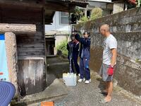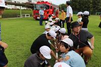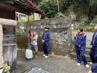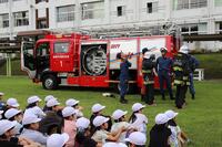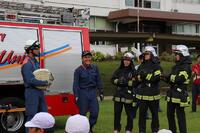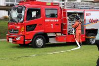 続いては、中学3年生の生徒3名が「放水体験」を行いました。特別に準備いただいた防護服やヘルメットを着用しての訓練です。3人ともとても似合っていて、カッコよかったです。1号車にはなんと、2トンの水が積んであるのです。児童生徒は水を通す前のホースの固さと放水中のホースの固さを実際に手で触り、体験することができました。