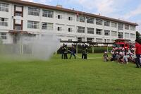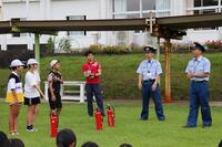 次に小学6年生の3名の児童が「水消火器」を使い、実際の火を想定した的をねらって消火活動を行いました。