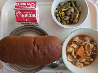 今日は、ポトフをいただきました。じゃがいもがホクホクでとても美味しかったです。マカロニサラダはハムやコーンが入っており、子どもたちも喜んで食べていました。