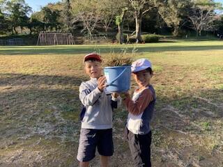 運動場では、ボランティアで草むしりをしている2、3、4年生。
