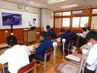 延岡警察署生活安全課少年係から2名の講師を招き、薬物乱用防止教室を行いました。まず、全国、宮崎県、延岡市における薬物に関する逮捕数と具体的な事件の説明を聞きました。その後、薬物等が体に与える影響について話を聞き、薬物の中毒作用の恐ろしさについて動画を視聴しました。危険薬物の恐ろしさを理解し、身を守る方法を学ぶ貴重な時間なりました。