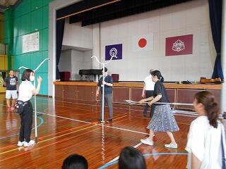 8月2日。午前中は、会議の後、不審者対応の研修会を行いました。先生方は、さすまたの使い方や、いざというときの身の守り方を、延岡警察署のスクールサポーターの先生方に教えていただきました。