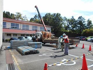 暑い中、朝から汗だくになりながら、足場の鉄筋を運んだり、組み立てたりしてくださる作業の方々。9月までかかる予定です。作業員の方々の働くかっこいい姿を見て、子ども達はたくさんのことを学んでくれることでしょう。