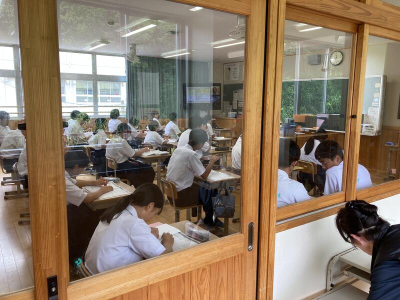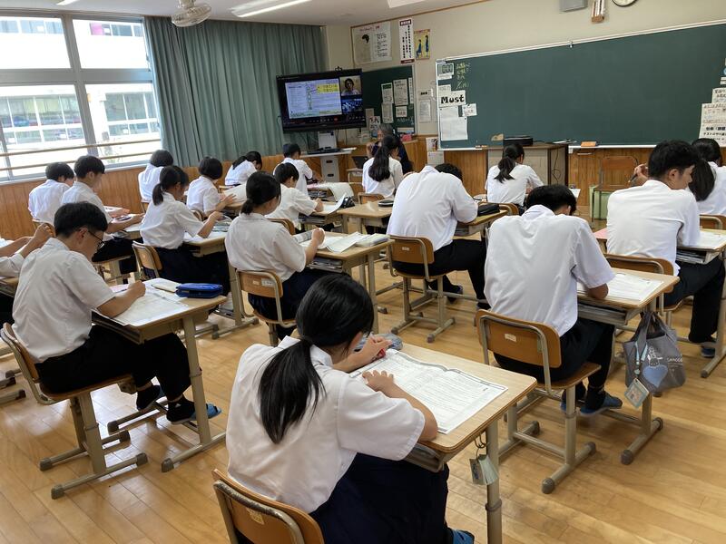 今年度から全10時間で論理コミュニケーションという学習に3年生が取り組んでいます。簡単にいうと「相手に伝わる文章を書くための勉強」です。大学の先生がオンラインで講師をしてくださいますが、内容と登場する言葉が難しいうえに、説明が多くスピードも速いため、生徒は一生懸命に取り組んでいるのですがついていくのに精一杯といった状態です。レベルが高いです。今日が9回目ということでオンラインでの講義は最後になります。生徒は最後まで、必死に話を聞いて一生懸命取り組んでいました。頑張って身に付けた文章力、文章を書くときの視点が、これから生徒が何回も何回も出会うであろう文章を書く機会に役立つと期待しています。