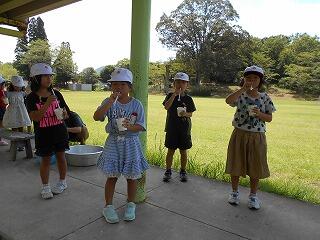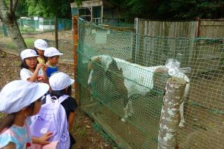 ダチョウ園ということで・・・。外には2羽のダチョウがいました。子どもたちは、「くびがながい~!!」「水ののみかたがすご~い!!」と大喜び。