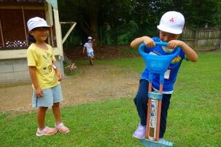 職員室の外がにぎやかだなと思ったら・・・。1年生がシャボン玉を飛ばしていました。