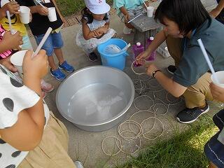 職員室の外で賑やかな声が聞こえてくるな・・・と思ったら、2年生がたらいを前に「かさ」の学習を行っていました。