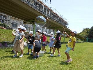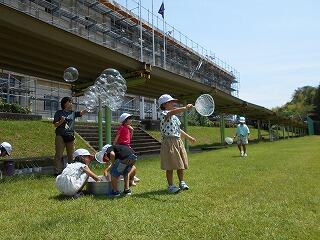 キラキラした子どもたちの笑顔と、虹色にキラキラ光るシャボン玉が心に残った生活科の時間でした。