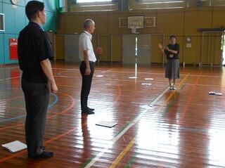 8月2日。午前中は、会議の後、不審者対応の研修会を行いました。先生方は、さすまたの使い方や、いざというときの身の守り方を、延岡警察署のスクールサポーターの先生方に教えていただきました。