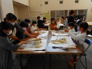 参加者は、数種類のドライフラワーとパンパグラスを組み合わせて、花の配置