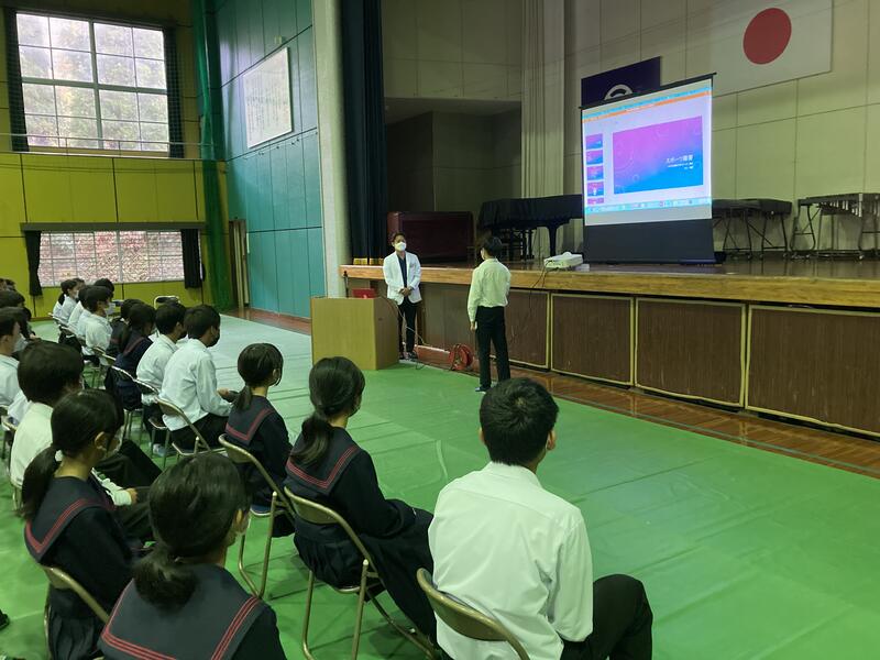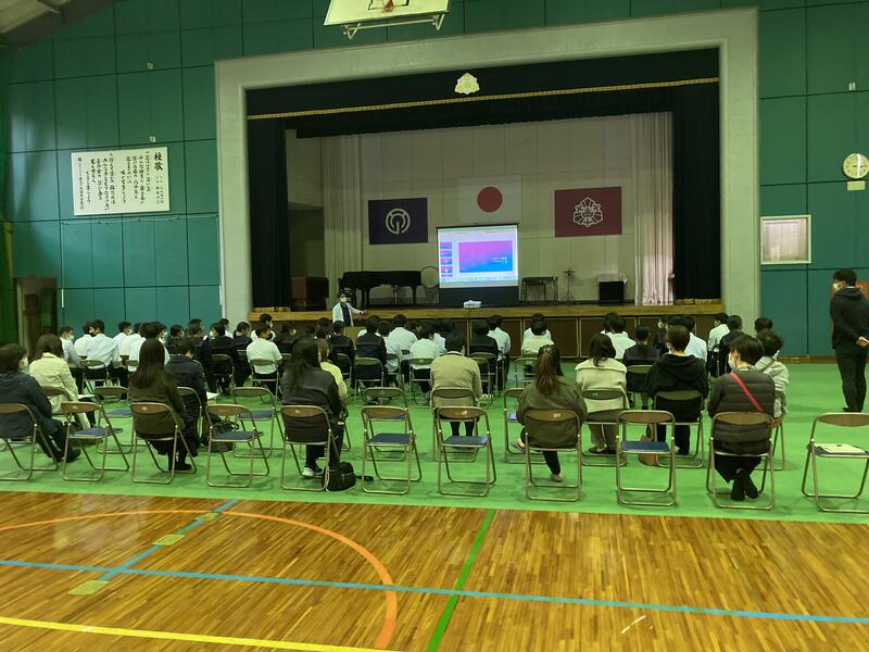 多くの生徒が海を見ながらお弁当を食べた後、午後は九州保健福祉大学に移動して体験学習を行いました。中学校と高校と大学の違いについて説明を受け理解を深めた後に施設見学を行いました。生徒にとっては初めて足を踏み入れた大学という空間だったので施設が大きいこと、立派なことに圧倒された生徒も多くいました。大学進学を目指している生徒の中には、大学という施設を見ることで、未来の自分の姿を具体的に想像できた生徒もいたようです。