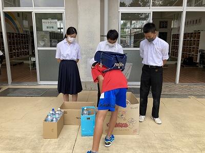 フードドライブは現生徒会役員が、今回の台風14号で被災した地域の方々に食べ物と飲み物と一緒に手紙を届けたいと活動してくれているものです。生徒の優しさやあたたかい気持ちが伝わってくる本当に素晴らしい活動だと思います。上南方地区で育った小学生と中学生が朝からたくさん心がこもった贈り物をもって登校してくれました。