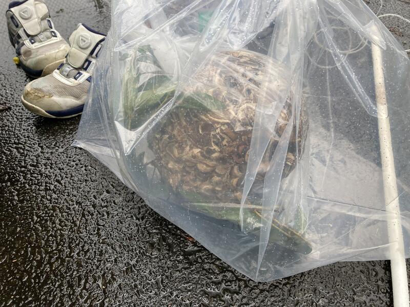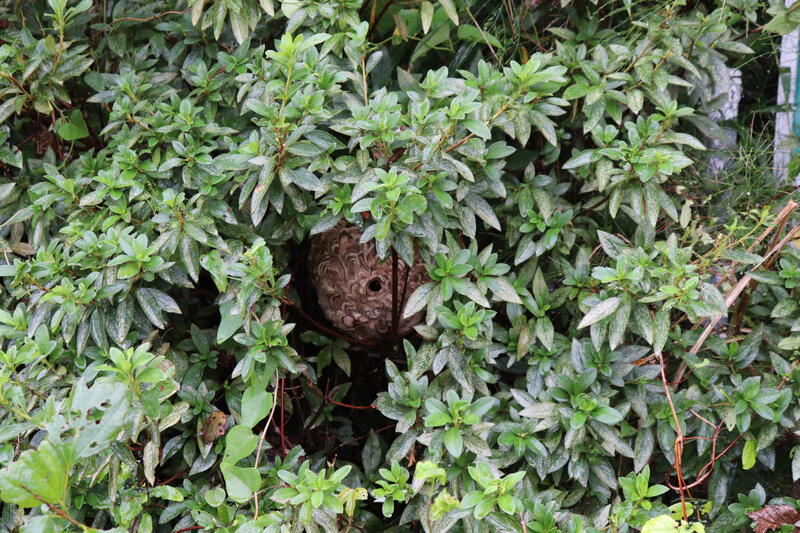 本日の朝、技術員の有馬さんが校内の樹木を剪定するために見回っていた際に、偶然スズメバチの巣を見つけてくれました。すぐに市教委に連絡をすると午後1時に業者の方が来てくださり駆除してくださいました。場所がテニスコートに近いところなので部活動の生徒や少年団の子供たちが刺される前に発見できてよかったと思っています。
