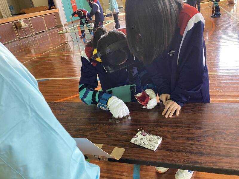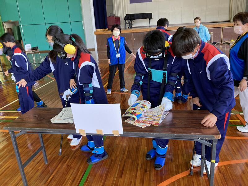 1年生が延岡市社会福祉協議会の協力を得て、福祉体験学習を行いました。内容は2校時に「アイマスク体験」と3校時に「高齢者疑似体験」です。「アイマスク体験」では2人1組になり1人がアイマスクを付け、目の見えない疑似体験を行い、もう一人がアイマスクを付け校舎内を歩く友達を誘導しました。「高齢者疑似体験」では高齢者の体を疑似体験するためにゴーグルやヘッドフォン、おもりや装具を身に付けた状態で、財布からお金を取り出したり、新聞や雑誌をめくったりしました。この経験がお互いを思いやる気持ちや行動につながることを願っています。