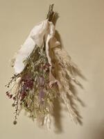 参加者は、数種類のドライフラワーとパンパグラスを組み合わせて、花の配置