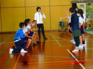その後、体育館に集まり、学校外で不審者に声をかけられたときの対応を6年生児童による寸劇を見なが